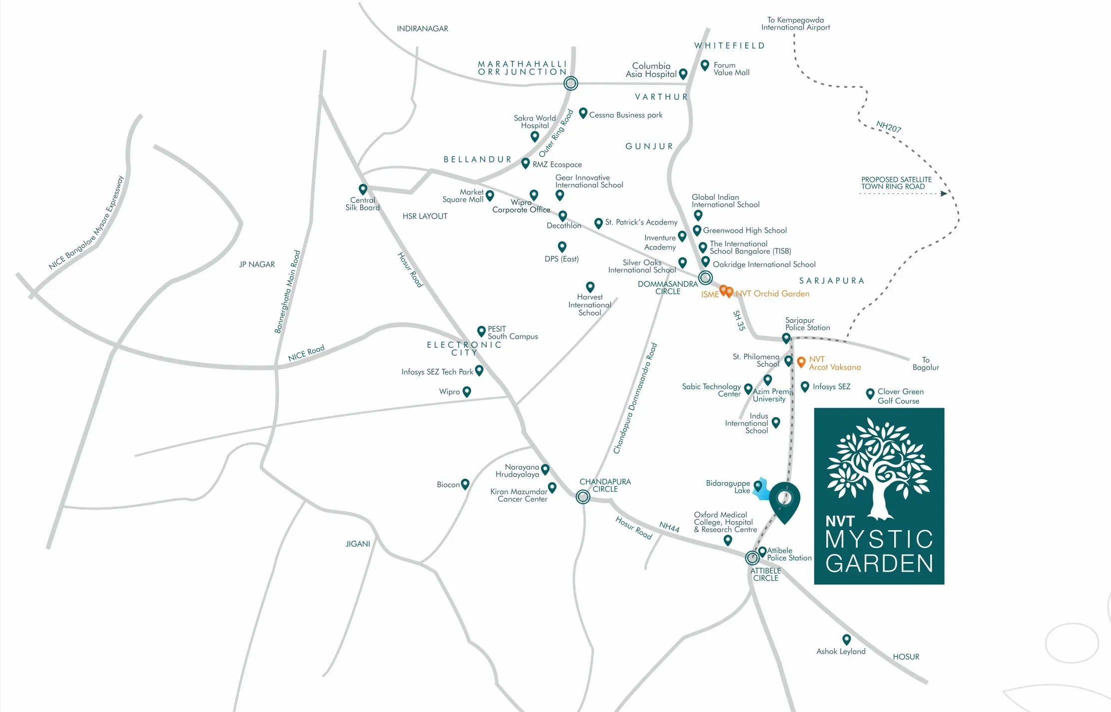 NVT Mystic Garden can be found along the Sarjapura-Attibele Road in East Bengaluru, right in the heart of a bustling residential area that links Sarjapur, Bellandur, and Chandapura. This spot offers direct access to Bengaluru’s major employment centers and infrastructure. With IT hubs, international schools, healthcare facilities, and key roadways just around the corner, it’s a great choice for anyone seeking a long-term residence.