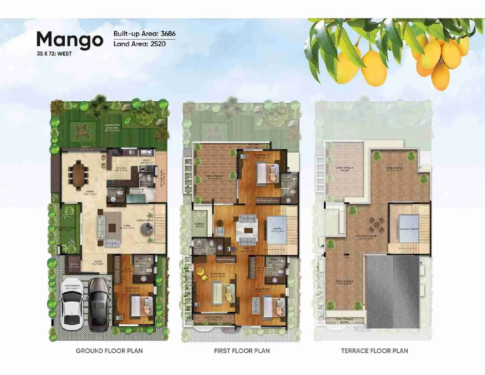 This project features five villa types- Lemon, Mango, Nectarine, Orange and Peach- each thoughtfully designed to accommodate various space needs. Homeowners can select from two floor plan options for each villa type: East-facing and West-facing, providing flexibility in terms of orientation, vastu preferences, and layout choices.